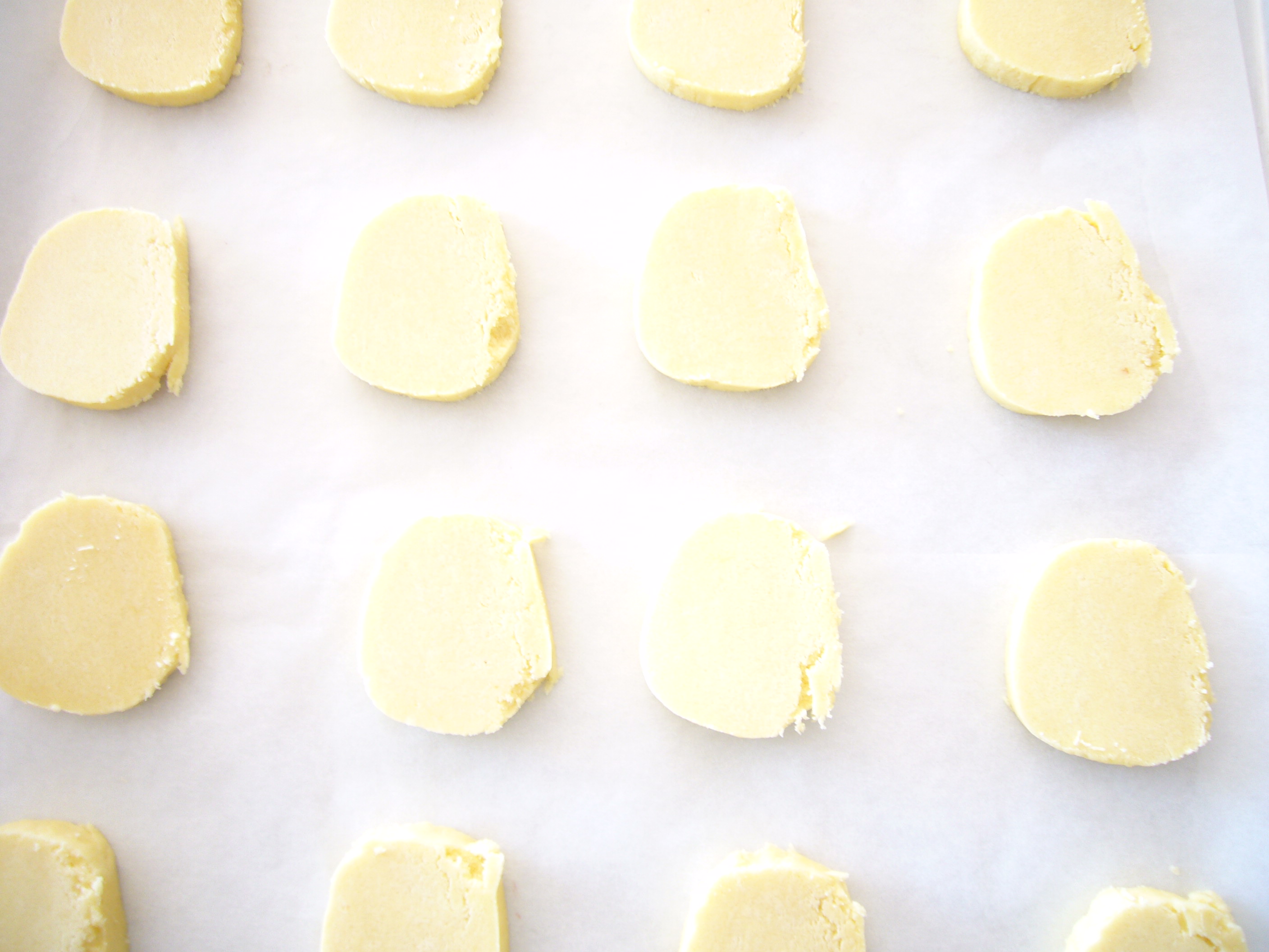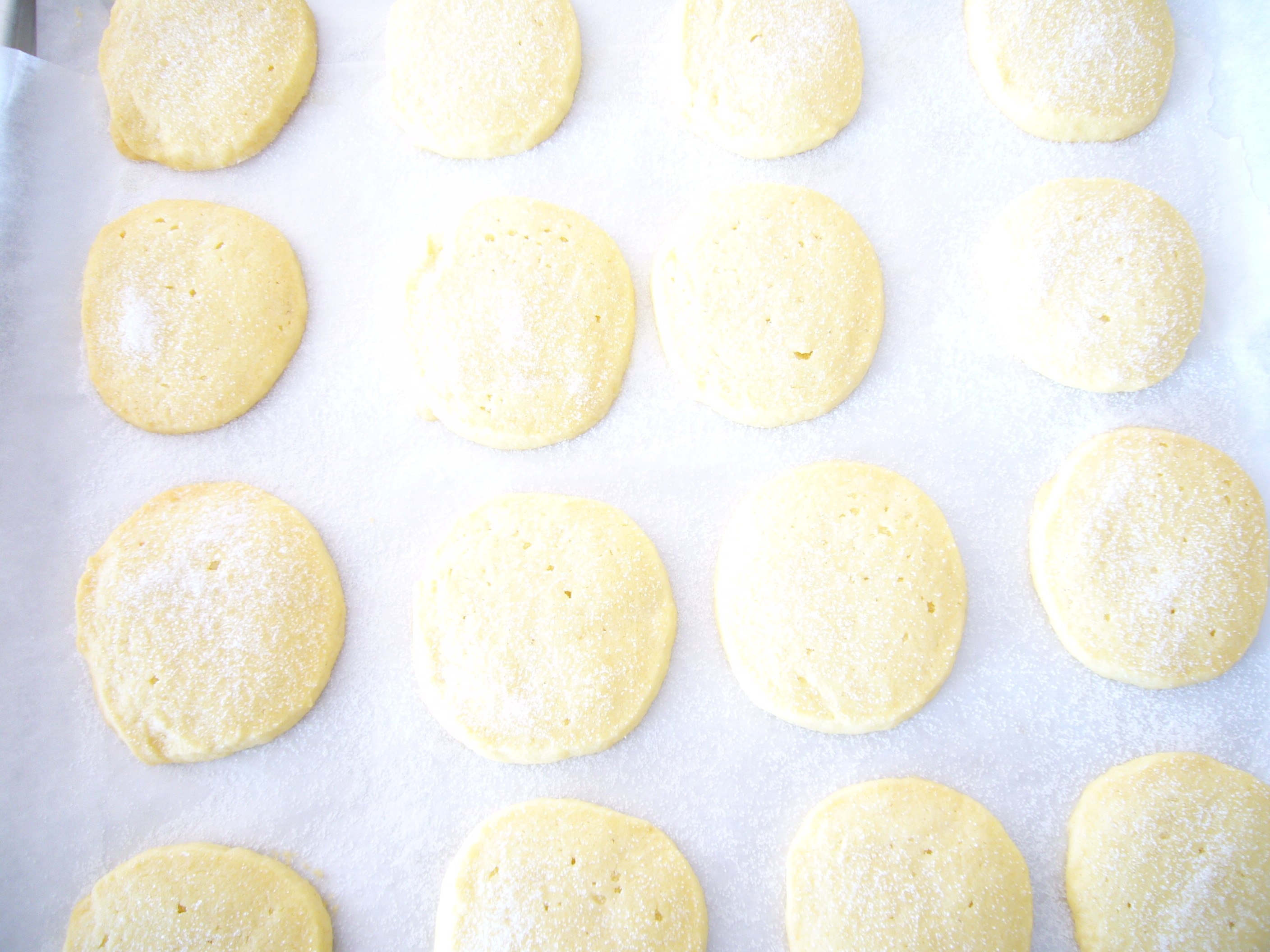 Preheat the oven to 150ºC fan bake and using a sharp knife cut the log into slices you can make up to 60 biscuits. Bake until they are just turning golden at the edges and absolutely allow to cool on the tray, any attempt to move them will break them. As I take them out of the oven I sprinkle with caster sugar but this is not necessary.
