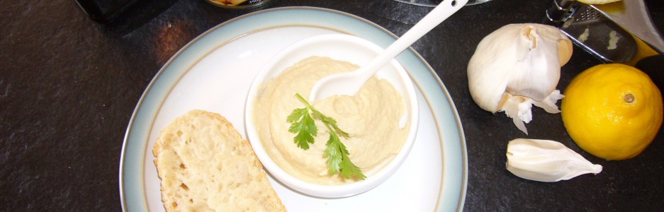 Drain a 390g tin of chickpeas and dump into a food processor or bowl if you are going to use a stick blender, add two cloves of garlic and 2 tbsp of tahini paste and blitz. Slowly add 4 tbsp of olive oil and 1 tbsp if warm water. Keep on until the mixture is creamy. Add the juice of 1 lemon and salt and pepper if you want. NOW EAT. SIMPLE.