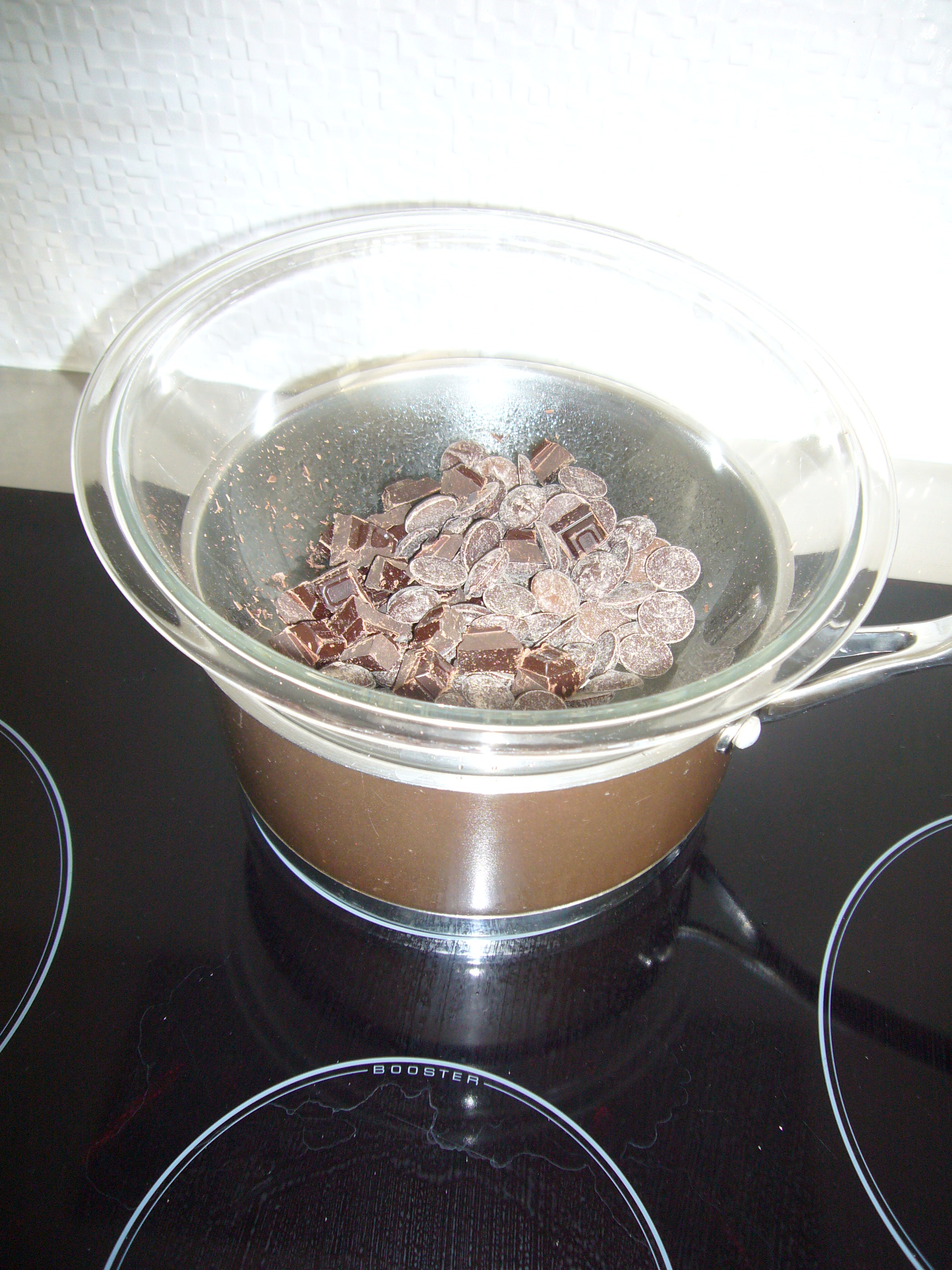 Use no less than 300g of chocolate, it does not matter really what you use, I just used open packets of buttons and some left over dark block, which I chopped. Chocolate chefs use couverture, which has a 35-50% cocoa butter content because it melts easily and is very smooth. Use this if you are a purest, but honestly, most people are just impressed and do not look for the finished shine!
