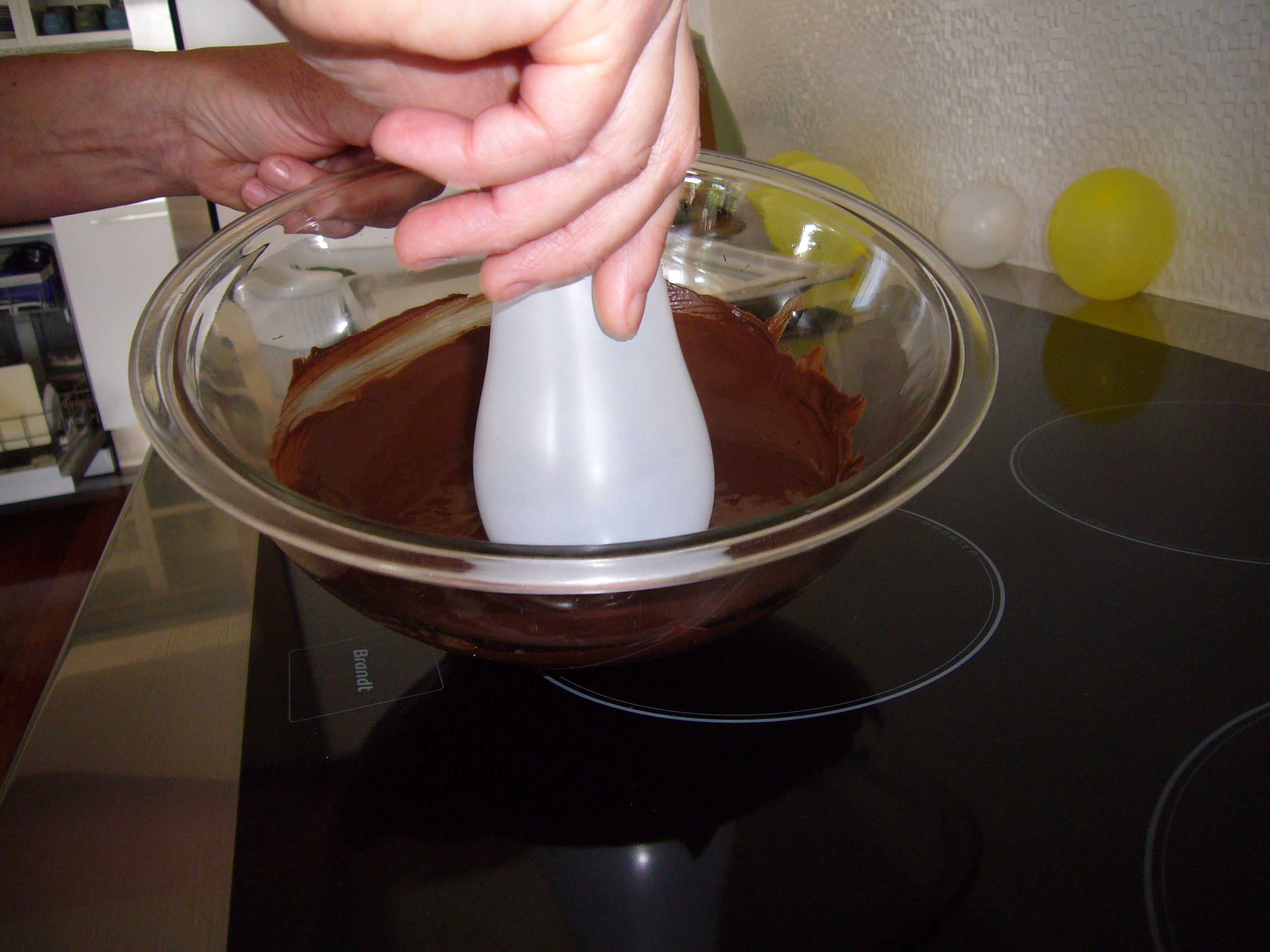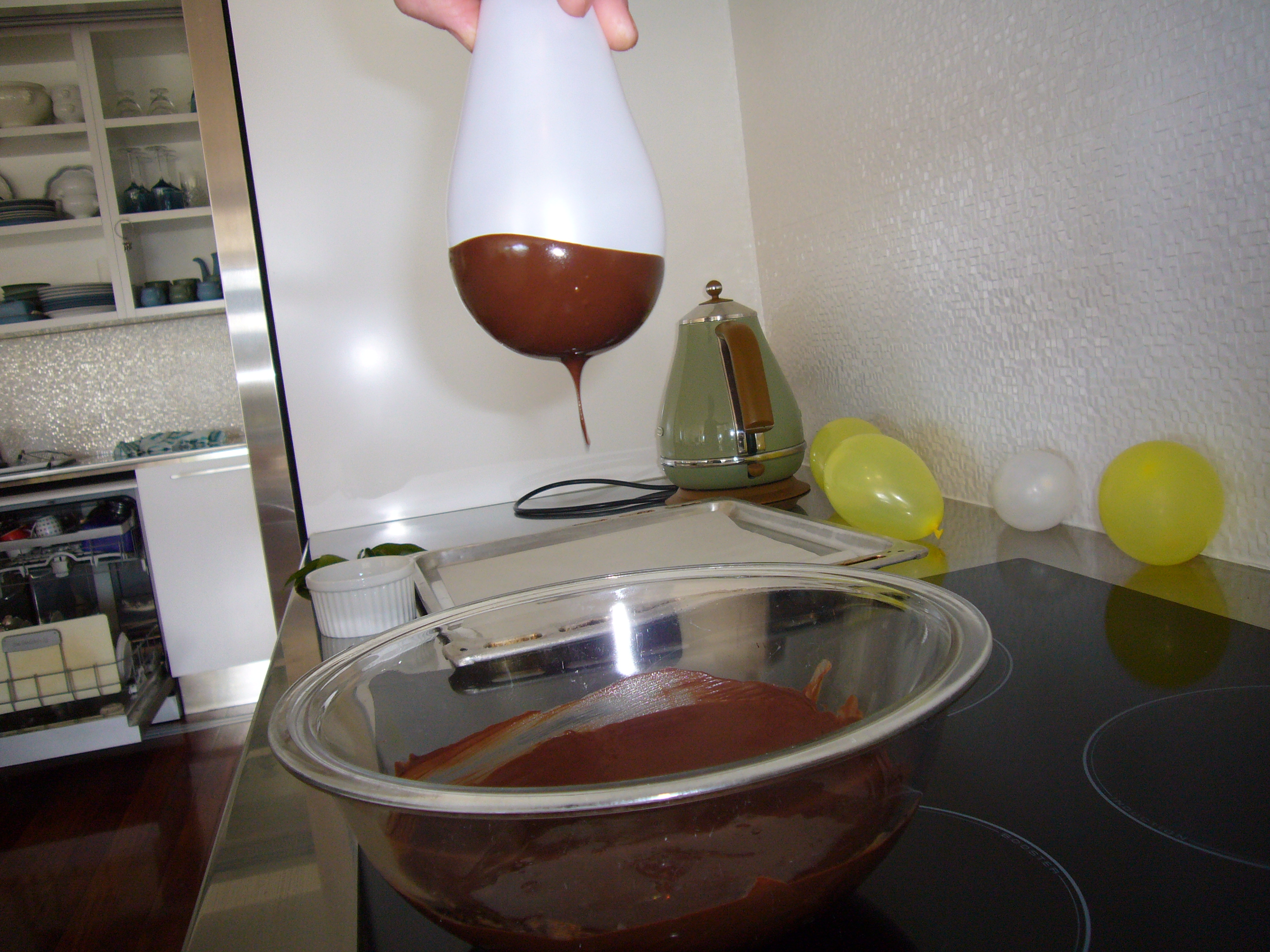 Feeling like a professional? Then go one better and turn your balloon upside down and pour the chocolate over the top, it has to be a little hotter for this so beware, too hot and the balloon will burst, too cool and it will not run. If you are feeling anxious do it in the sink to avoid a chocolate mess. As a cheat I put two bowls together………