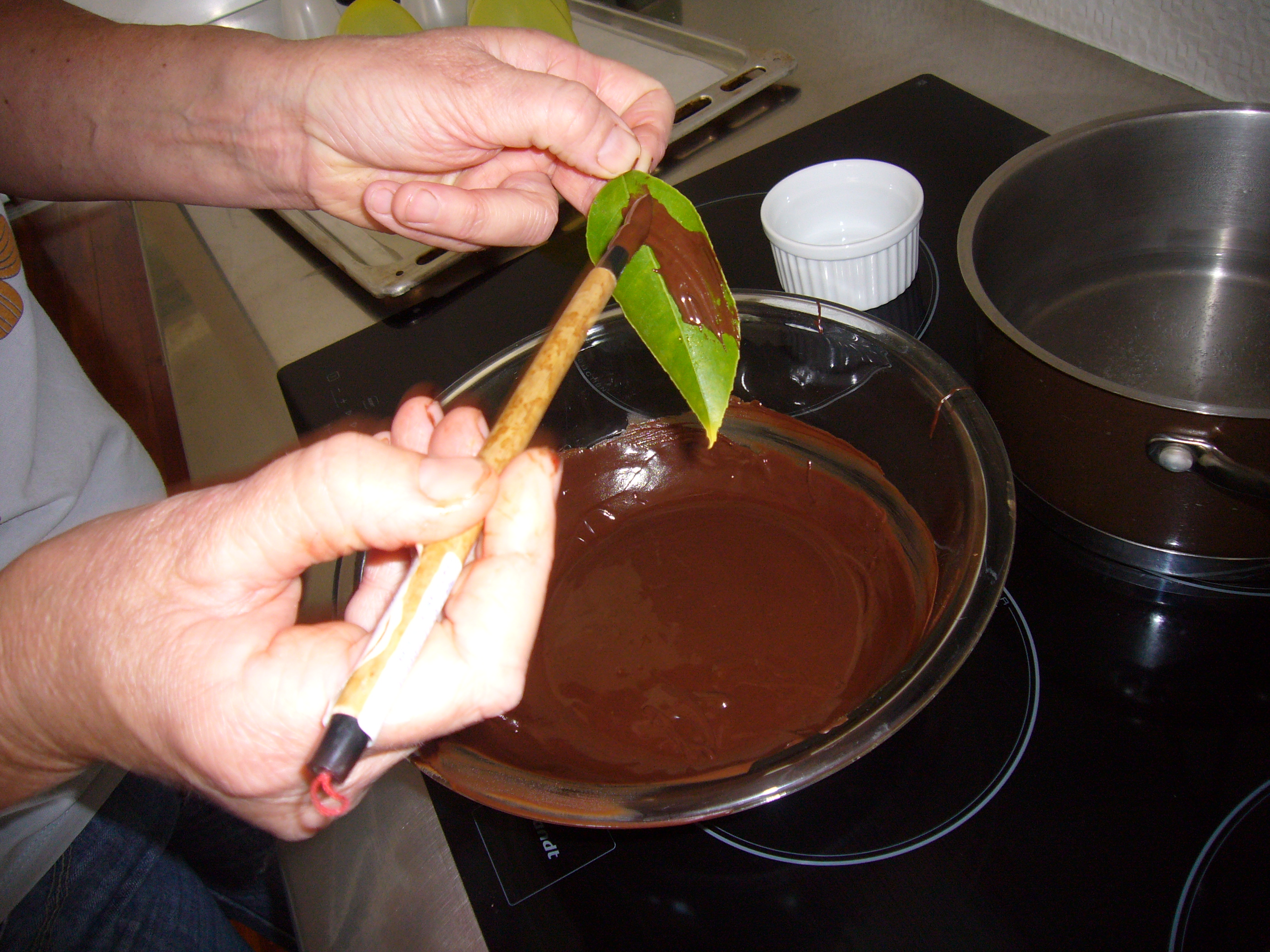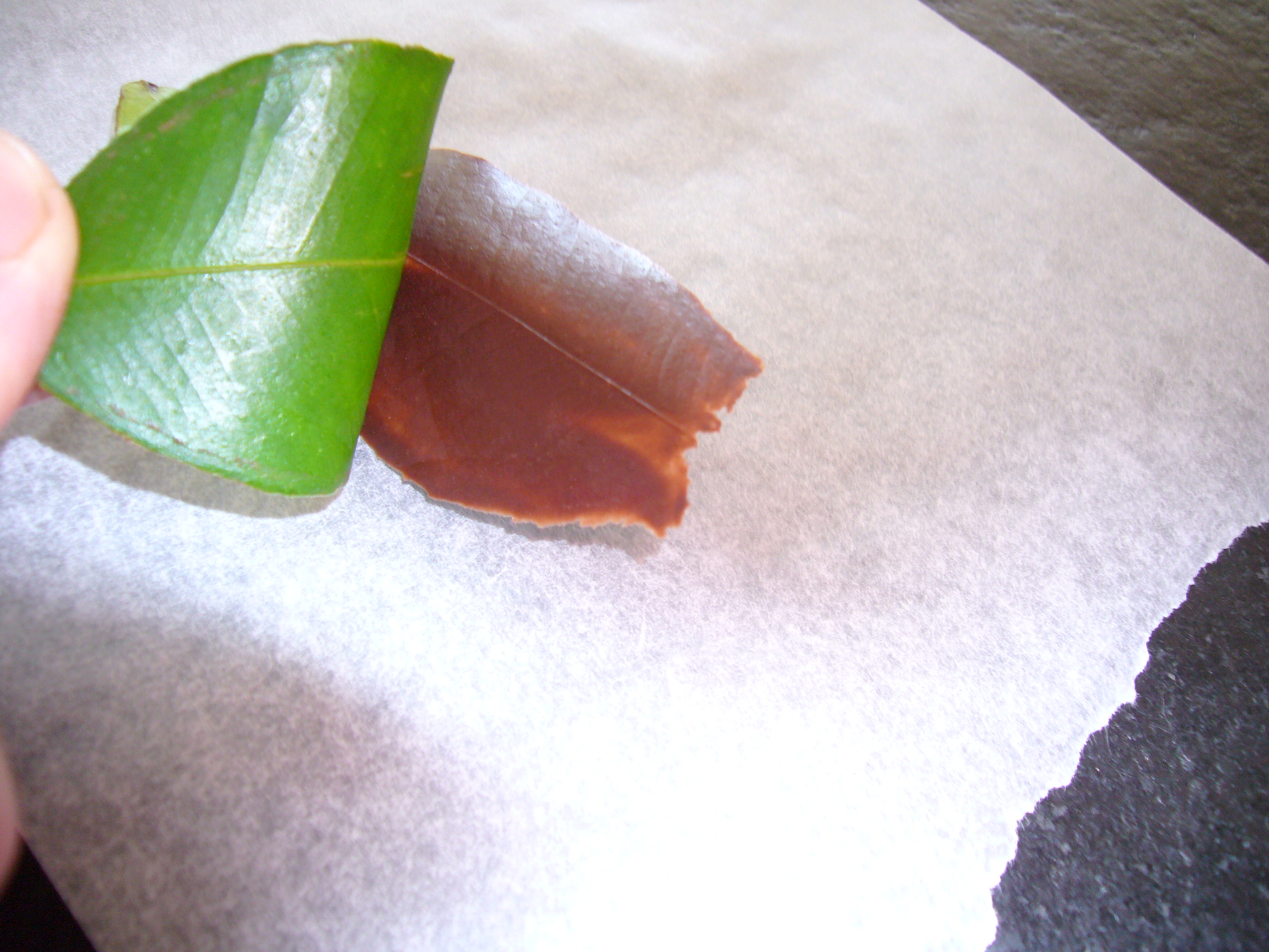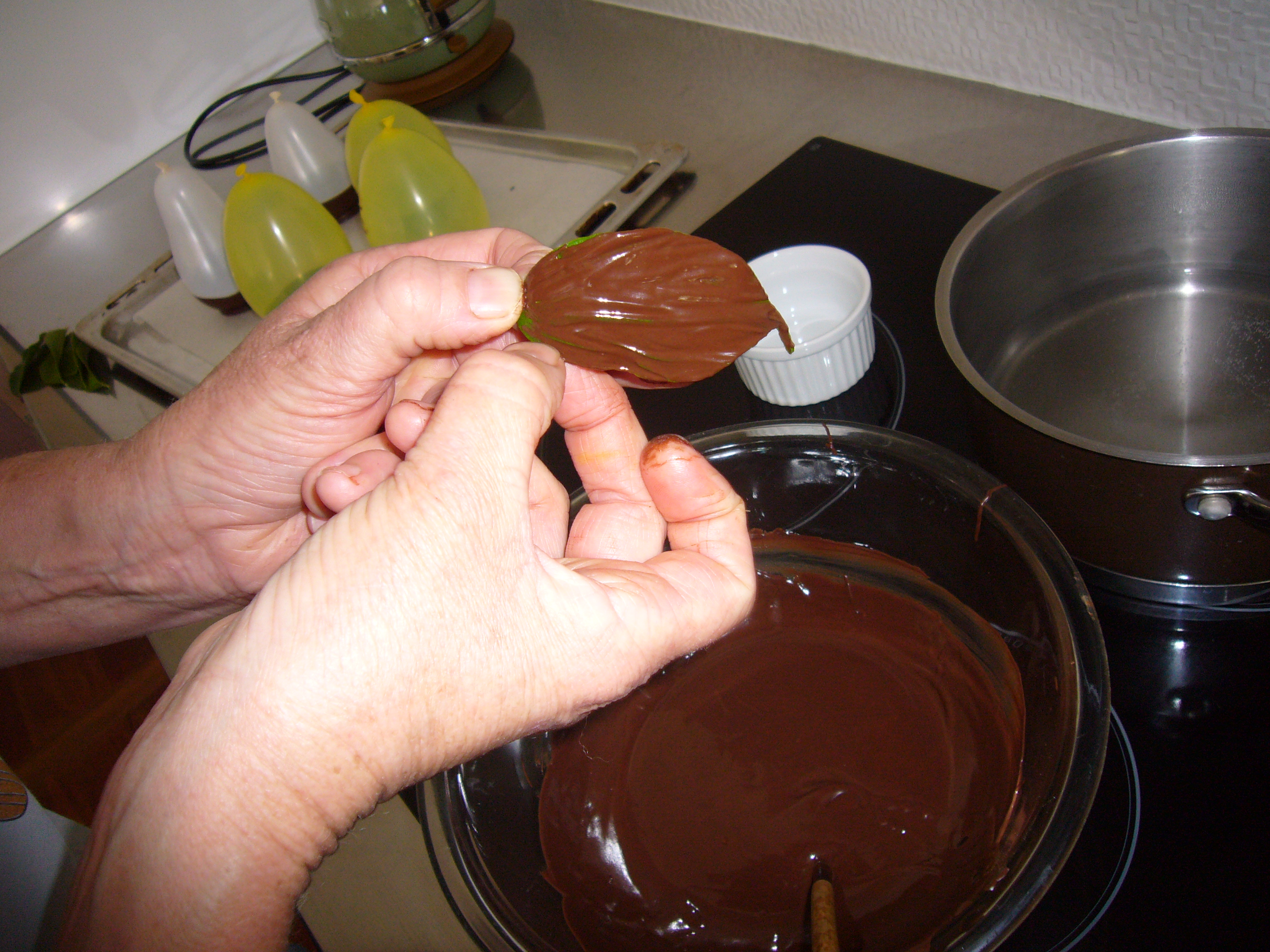 While you have the mix, make some leaves. I went into the garden and got some lemon leaves, but anything shiny and firm, which have raised veins on the underside, and is obviously not poisonous, works well. Simply paint the chocolate onto the shiny surface of the leaf with a brush and then with your thumb and forefinger in a pinch run around the outside edge (this will make it easy to release). Put on the sheet with the balloons. When set peel away the leaf, I always go from the side. Ta da.