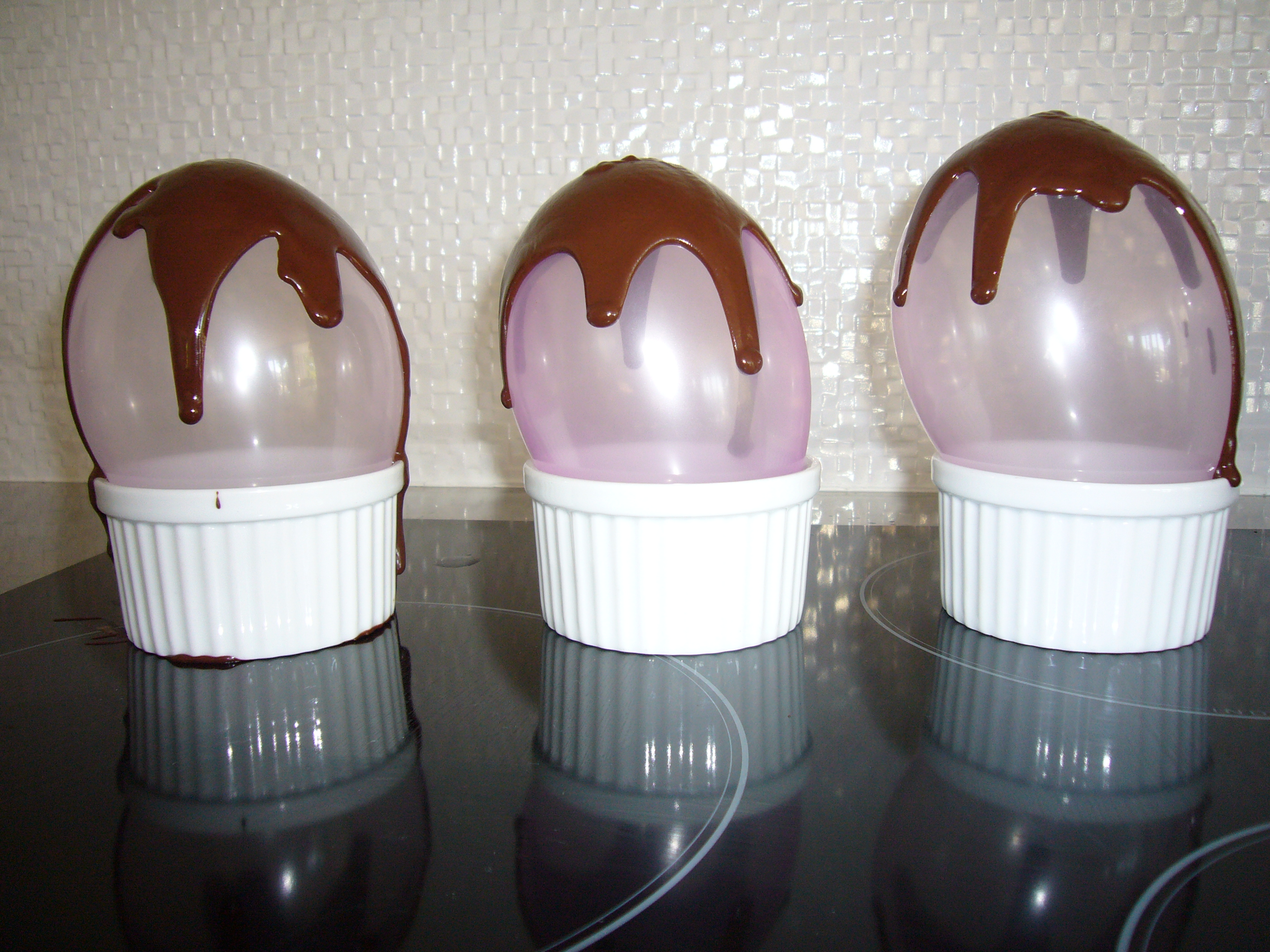 TIP Always melt chocolate slowly and gently, and it can be done in the microwave, a friend told me the secret is to stir frequently. If your chocolate seizes (becomes a rough, hard mess) do not panic, you can rescue it by adding a fat; vegetable shortening, clarified butter, vegetable oil or cocoa butter a teaspoonful at a time. Always use a good balloon, not cheap water balloons, as they stick. I have been told a little oil on the balloons guarantees a smooth release, but I have never tried it. You can also add a flavor to the chocolate, just make sure they are both at the same temperature when you mix.